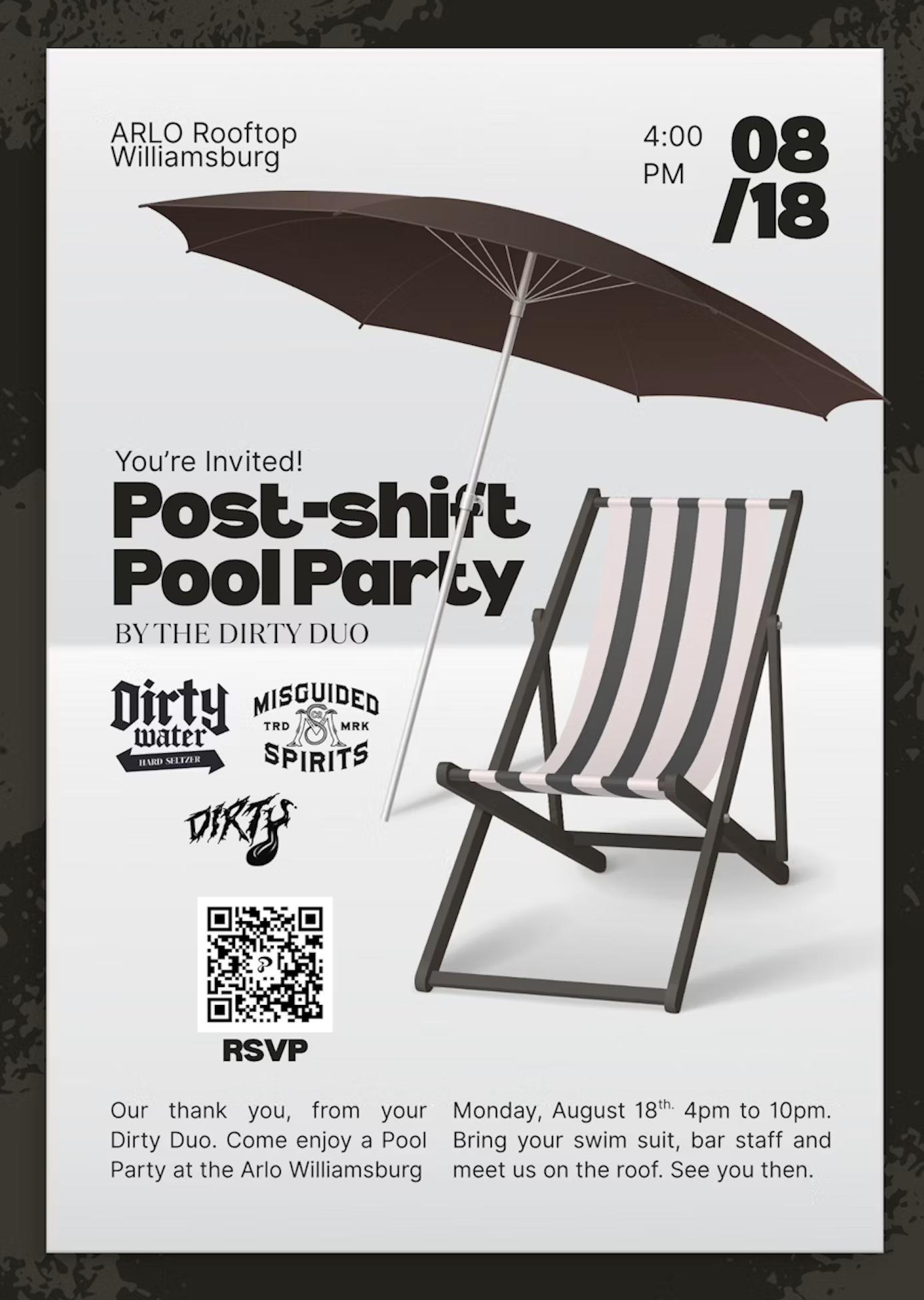 For our bartending family, you deserve a break! Take a load off on the rooftop pool of the Arlo Williamsburg and enjoy DJ’s, sunset views, and drinks by Misguided Spirits and Dirty Water.